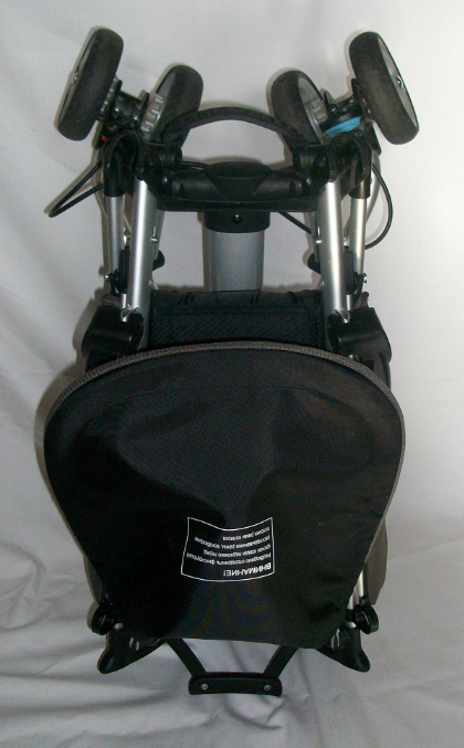 Очень быстро складывается-раскладывается и удобно носить за специальную ручку. Есть небольшой сетчатый кармашек для мелочей - но я докупила маленькую сумочку в цвет коляски на пояс для мамы - куда спокойно помещается бутылочка, влажные салфетки, ключи и телефон - удобно повесить на коляску или пристегнуть на себя (в подарок к коляске).