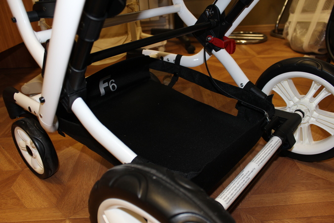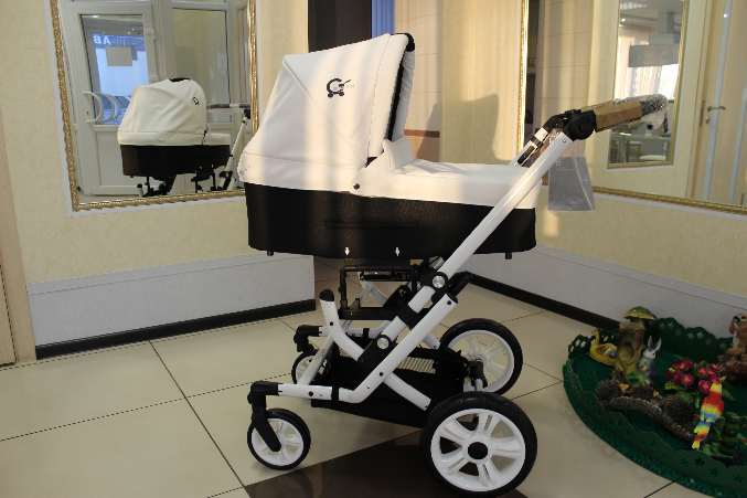 Итак, люлька - верх - нежная белоснежная экокожа (по сравнению с Hartan экокожа в Gesslein намного мягче и приятнее на ощупь, к тому же не мнется!) низ каркаса - плотная водо-грязе отталкивающая черная ткань. Люлька крепится к шасси с помощью специальных адаптеров, снимается нажатием на специальные рычажки с обеих сторон! Капюшон прикреплен к каркасу в трех местах - по бокам и сзади на липучке, т.е. в промежутках имеются просветы (надеемся зимой не будет задувать!). Кап опускатся/поднимается нажатием кнопки с правой стороны.