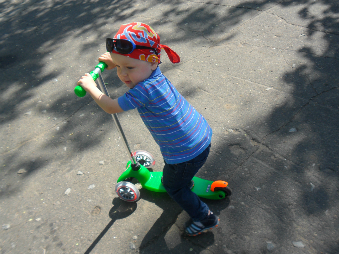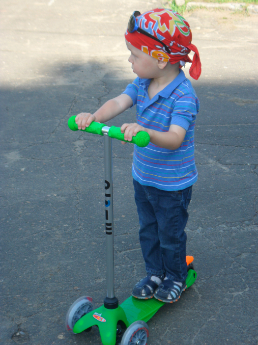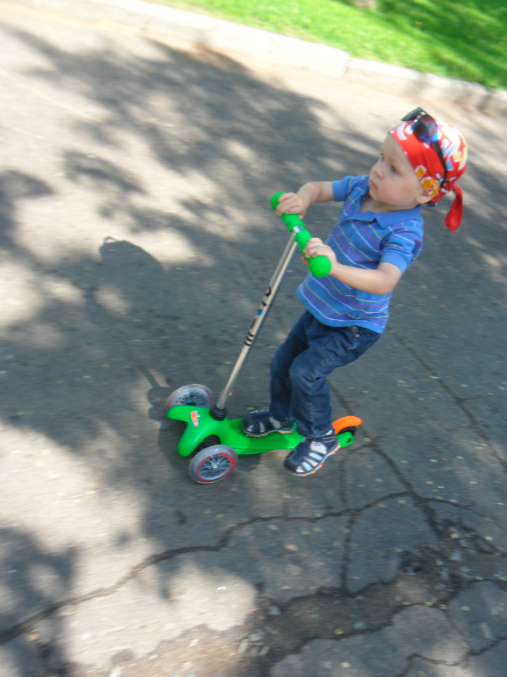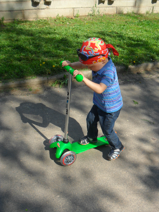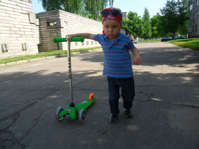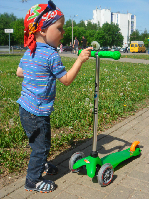 P.S.: на прогулке сынулик придумал множество вариаций использования самоката: и катил его между ног как беговел, и садился попой как на машинку, и просто катил его взявшись сбоку за ручку, становился двумя ножками и просил прокатить его... А также затаскивал его на бордюры... И даже дул "вместе" с ним одуваничики))))