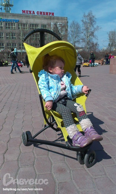 ..Помню, лет эдак пять назад я взяла у подруги ролики, при этом уже как лет с 15 на них не ездила. Мои ролики были такие, ну обычные, с каучуковыми розовыми колесами, а вот у подруги те ролики, которые я взяла, были какие-то суперски-навороченные, колеса у них какие-то супер-быстроходные с какими-то там АБЕКами.. В общем встала я на эти ролики и сразу же шибнулась на копчик так, что больше кататься у меня желания не было..потому что они ехали сами! Ты стоишь вроде, а они едут.! К чему это я.. К тому, что у йезза по ходу этот АБЕК еще круче, чем на тех роликах!! Коляску надо всегда ставить на тормоз, иначе улетит. И за этот чудо-юдо ход я прощаю ей то, что она тарахтит по плитке, что я не знаю, сколько она проживет, ибо прочностью йеззовские рамы не отличаются и даже полное отсутствие хоть какой корзины.. (Купила карабин на ручку - проблема решена:)) ну и спинка не раскладывается, в связи с этим сейчас в поиске легчайшей коляски для отдыха.. пусть хоть с чуточку откидывающейся спинкой.. Смотрю на глоб и мэджикал эир априку...