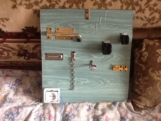 Мы сами вот такой стенд сделали, правда так что то и не до делаем до конца, хочу как раз замок навесить и еще всякой мелочи. Но даже в таком виде дети с удовольствием играют. В кадр не попала вилка в розетку, на веревочке, купила просто вилку, раскрутила ее и привязала шнур. Безопастно и поучительно для детей. С шпингалетами и так понятно, черное- это ролики на еоторых стулья ездят, любят крутить их. Кольцо полностью выкручивается, потом вкручивают назад. Уголок, для того что б удобно было переносить))) ну и как деталь.
