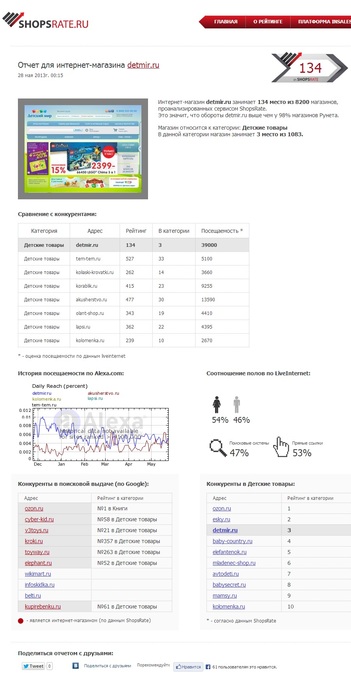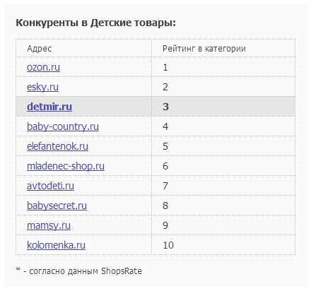 ShopsRate — первый в Рунете проект, который позволяет сравнить ваш интернет-магазин с конкурентами по основным показателям: посещаемости и обороту. Эти данные позволят понять, ваши позиции и результаты относительно конкурентов.
