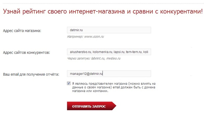 На первой страничке нужно ввести магазин, который хотим сравнить с конкурентами (я для примера взяла Детский Мир,тк его популярность вопросов не вызывает..), еще нужно вбить несколько интернет-магазинов - конкурентов, ну и в конце почту (тут пишем любую почту, главное - чтобы она типа принадлежала указанному в первой строке магазину).