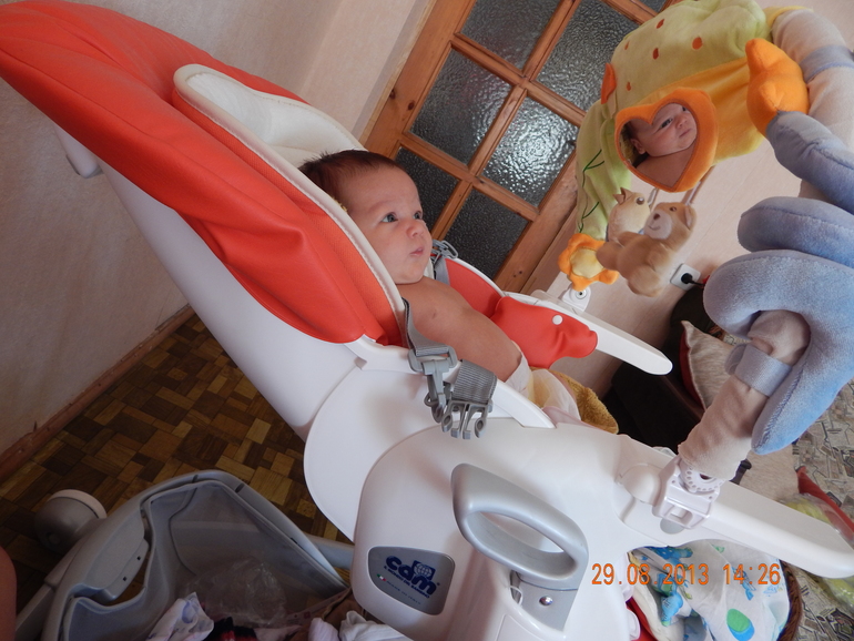 У нас такой же, зелененький )))Возим его всегда с собой, и к родителям, и на дачу. Начали использовать в 1,5 мес как шезлонг, ребенок с удовольствием там сидит долгое время. Так что этот стульчик мой верный помощник - я делаю свои дела, а малыш рядом наблюдает!Из недостатков - не очень удобно его передвигать, одной рукой невозможно это сделать