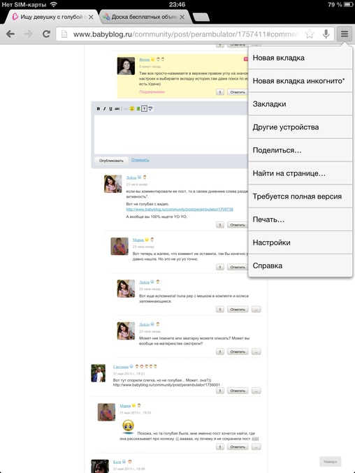 Да, на айпаде. Полоски есть, вчера лазила по ним, что то ни чего путно-дельного не нашла :( видимо всё безнадёжно, видать не судьба мэту про эту коляску ещё раз почитать :)))