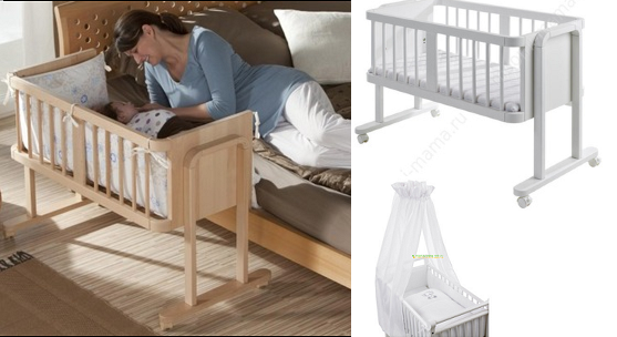 - спинка полностью может сниматься, и колыбель крепится к родительской кровати - малыш рядом;