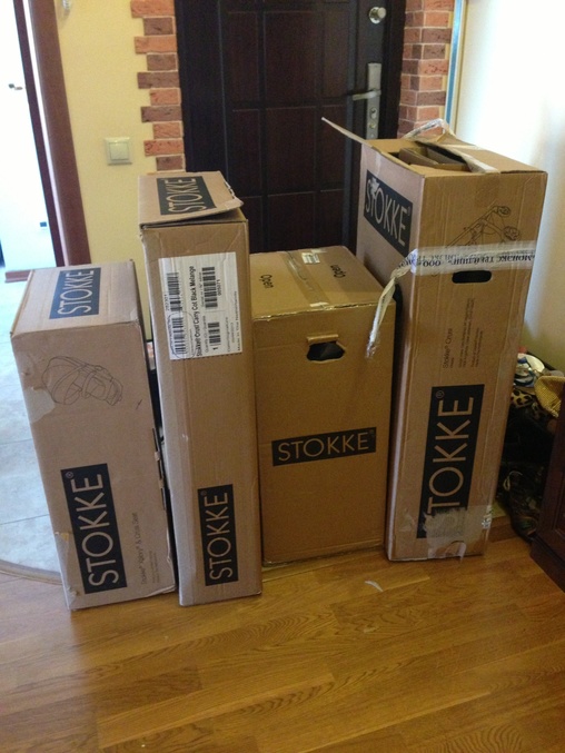 Вот так выглядят упакованные шасси, люлька, прогулка и автокресло - теперь жду мужа, чтобы все открыть, собрать, покатать и т.д. )))