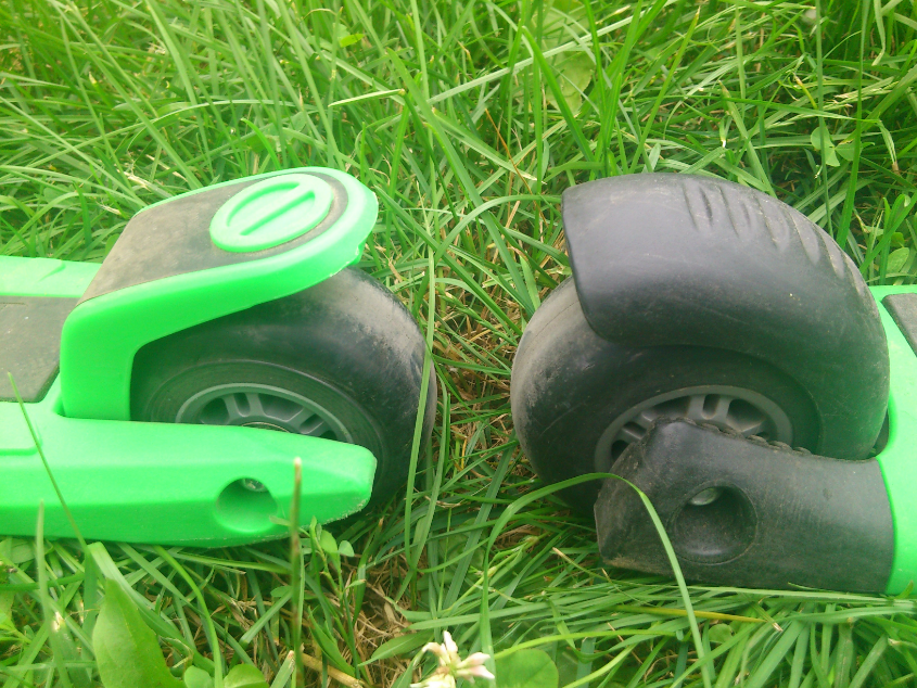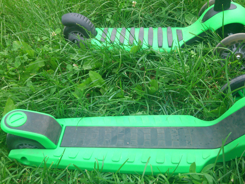 1. Платформа. На обычном глайдере она чуть шире (минимально, но все же), посадка ее ниже, т.е. зазор между платформой и землей меньше (это актуально тем кто берет такой самокат совсем малышам, сегодня полуторогодовалый опробовал и то и то, макси ему явно велик именно по этой причине). Самый частый вопрос на ББ - что проризинено, а что нет? Ответ и тот и тот. На обычном глайдере резиновые полоски идут параллельно рулю, на макси черная продольная полоса на платформе это резинка, ребенок не скользит.