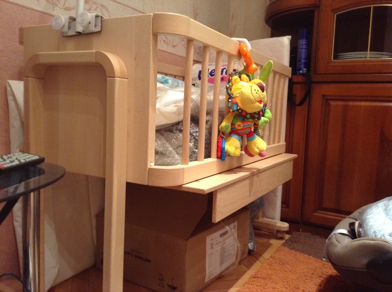 Крепится к родительской кровати с помощью выдвигающейся планки, которая цепляется за борт взрослой кровати. Я заказывала из Германии через babyshop.de. Мне она обошлась в 10 тыс с доставкой. Такую же можно купить и через многие интернет-сайты российские, но цена будет в районе 19-20 тыс. Из Германии она дошла до меня через 19 дней с даты оплаты.