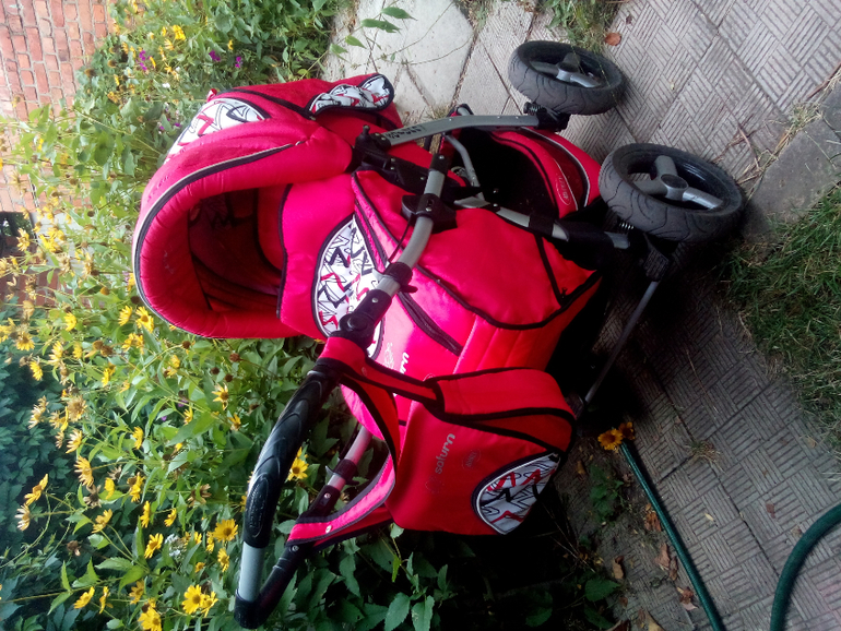 Выставка наших колясок (только хвасты)Свозив однажды нашу бугу на дачу и соответственно дважды разобрав-собрав в багажник , встал вопрос о покупке дачного варианта с постоянной пропиской в сельской местности . Ну жалко бугу и в багажнике и по "целине" катать ! И решила я, не мудрствуя лукаво, взять для этих целей что-то дешевое , б/ушное, желательно трансформер. Как говорится "сойдет для сельской местности" ))) ! В результате поиска был найден полугодовалый Adamex Saturn. На момент покупки у него было лопнувшее клеенчатое окошко в капе ( не вынесло зимних морозов) , не работал тормоз с одной стороны ( у него тормоз с двух сторон из-за перекидной ручки) и вывалилась кнопка в суставе регулировки высоты ручки. Но для меня эти ньюансы не имели практического значения да и цена 60 $ ))) .