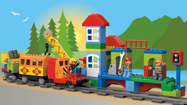 Мы на 2 годика купили большую ЖД лего дупло, поезд в ней с мотором и звуком. Дорога с мостом, детали оч качественные и крепкие, сын собирает легко сам. В наборе можно кран построить еще, есть человечки. Посмотрите у них на сайте http://duplo.lego.com/ru-ru/products/10508-deluxe-train-set