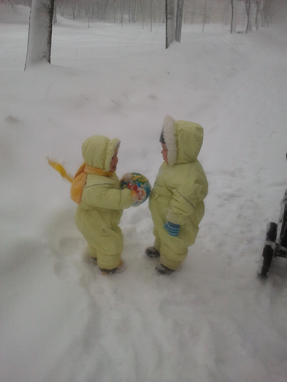 Самое забавное было, когда встретили мальчика в таком же комбезе во дворе. Они тааааак друг друга разглядывали, стояли минут 10 таращились ))) Вот, нашла даже специально.