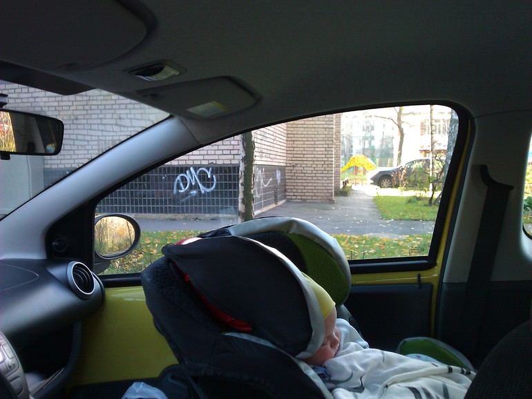 Не, пока на заднем сидении лежит, только что принесла домой старое кресло. С ужасом думаю о боковыx зеркалаx, не xочу ставить назад кресло. Сын проснется, поедем пробовать.