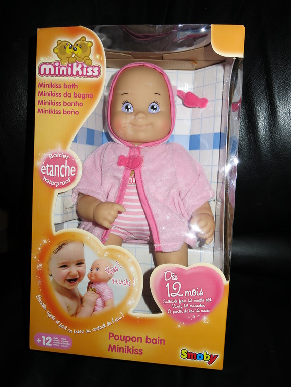 У куколки Minikiss есть специальный купальный костюм из быстросохнущей ткани.Когды вы окунете куклу в воду она засмеется, выражая свою радость. После купания куколка пошлет Вам воздушный поцелуй.Чтобы малышка не замерзла после купания на нее надо сразу надеть халатик.Игрушка выполнена из высококачественного пластика и ткани - личико и конечности куклы пластиковые, всё остальное из ткани.Высота куклы 27 см