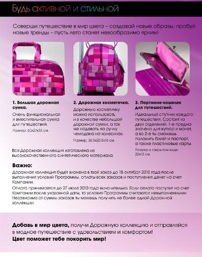 а еще однажды в 2010 по-моему мне перепала такая коллекция вообще из эйвон,так там сумень огромнейшая,а то,что называется дорожная косметичка-очень вместительна для косметички,а для мамской сумки самое оно,я её брала в дорогу,туда помещались шмотки игрушки и тоже кармашки..ну это так для интереса покажу=)