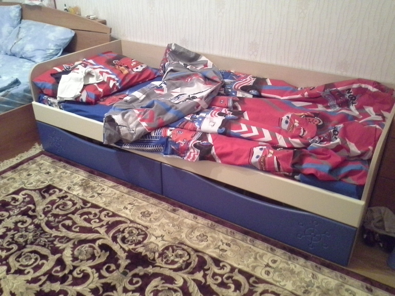 Спит на кресле-кровати, раскладываем не на всю длину, в итоге почти половина спального места загорожена подлокотниками) Впрочем, ттт, он и без подлокотников ни разу во сне не падал.