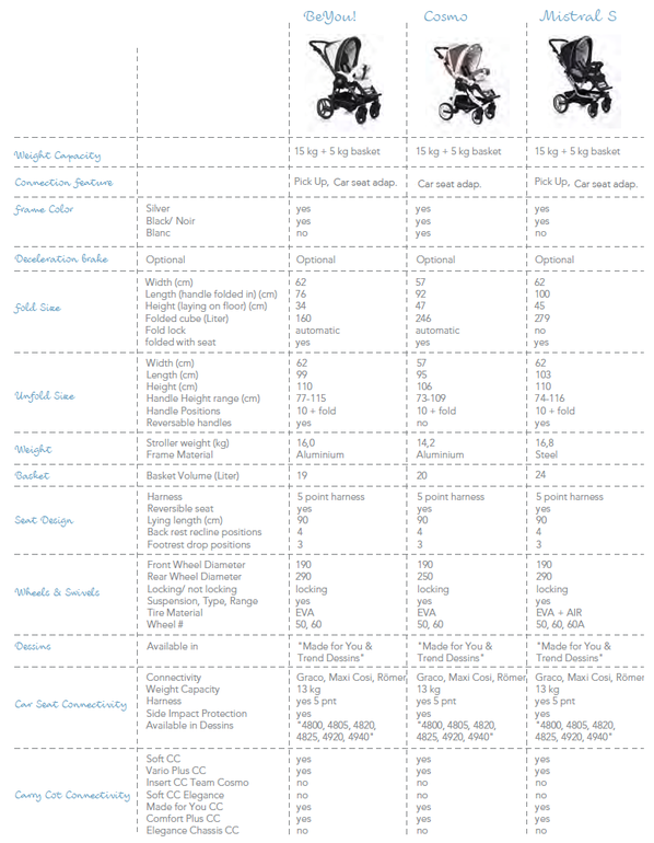 Тут вопрос приоритетов- что для вас важнее: функциональность, амортизация, компактность, ценана сайте Теутонии есть сравнительная таблица всех моделей:BeYou самая популярная модель (по признанию продавцов), т.к. самая функциональная и шасси у нее самое компактное (почти в два раза в сложенном виде меньше остальных). Среди функций есть перекидная ручка и поворотные колеса Mistral S по функциям идентичная, но более тяжелая и в сложенном виде занимает гораздо больше местаMistral P значительно тяжелее собратьев, она менее функциональная (нет перекидной ручки и колеса неповоротные), но колеса у нее камерные, она проходимее и амортизация на высотеCosmo похожа ни BeYou, но нет перекидной ручкиFun - самая ограниченная в функционале коляска, и потому самая дешеваяя для себя выбрала BeYou, сейчас жду посылку из Германии
