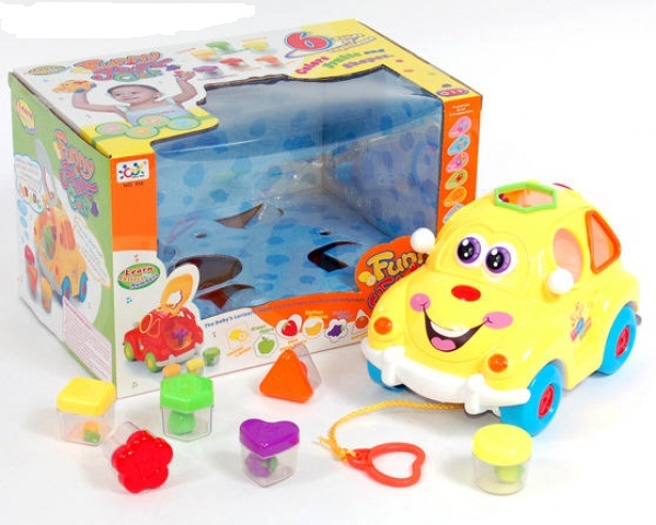 привет! нам дедушка подарил такую машинку-сортер (только красную): мигают огоньки, поет музыка (можно отключить), открывается багажник, вставляются фигурки, каждая фигурка брямчит. Сначала просто катал машинку и звенел фигурками, а теперь 10мес. уже вставляет в сортер, только черти как конечно))) нашему понравилась очень, дарил дедушка так что думаю не очень дорогая