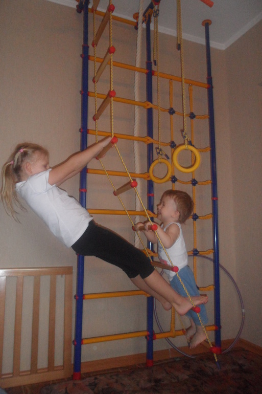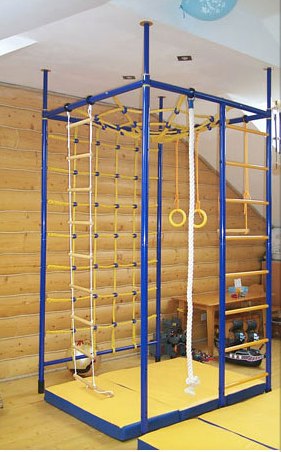 У нас такой    Еще покупала отдельно турник железный, который можно переместить на любую из перекладин, то есть регулировать по высоте, а можно совсем снять. Оказалось, очень удобная штука, т.к. если ребенок висит на верхнем турнике, его приходится ловить, а так опустил по-ниже, и он сам спрыгивает на мат. Старшая опускает его на середину, кладет сверху мат - это у нее дом)) Вот так он выглядит   Конечно, со временем интерес ослабеет, чем в первые недели, но все равно штука нужная очень. Да и без присмотра на нем не оставишь, младшего, день на третий после покупки, нашла ночью на лестнице под потолком, сидел там и шепотом меня звал, т.к. спускаться он еще не умел! Интерес можно продлевать покупкой новых снарядов, есть тарзанка например и т.п.