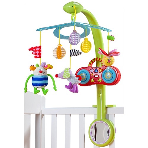 У нас вот такой мобиль, он проигрывает mp3 с флешки, я только немного перешила веревочки, чтоб игрушки лицами на ребенка смотрели.