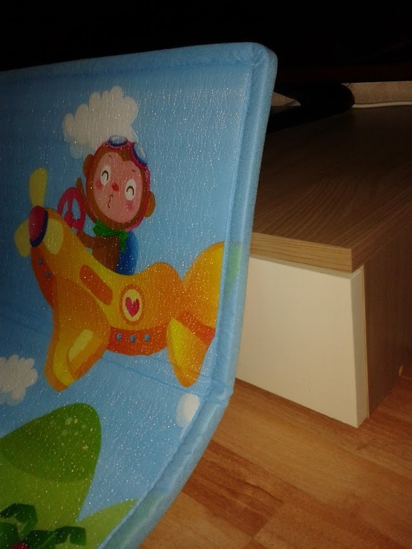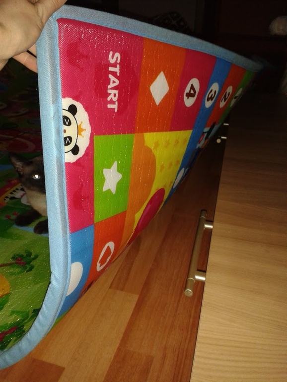Расцветка у него не для эстетов слабонервных, аляписто-китайская, но покупался он не для того ,чтобы радовать мой глаз, а чтобы уберечь моего дитёныша от шишек и холодного пола. Надо сказать, что 2 см толщины с этим справляются на ура.