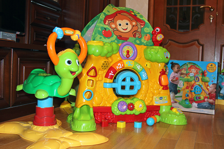 Понравилась каталка -паровоз от VTECH на верёвочке. Уже получается самому катать. Находить фигурки, ставить по местам. Любит слушать песенки.