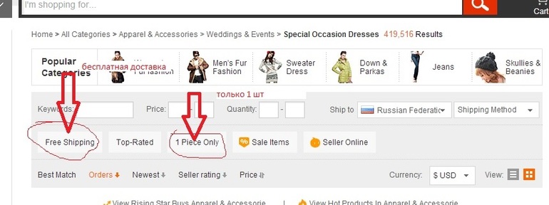 Я обычно пользуюсь этими двумя кнопками. Не знаю почему, но на али один и тот же товар может быть как с платной так и с бесплатной доставкой.