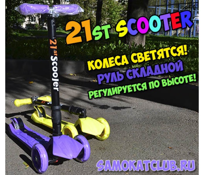 Cамокат 21 ST Scooter со светящимися колесами + регулируемая по высоте складная ручка. Для детей 3-8 лет. Цена 2999руб.