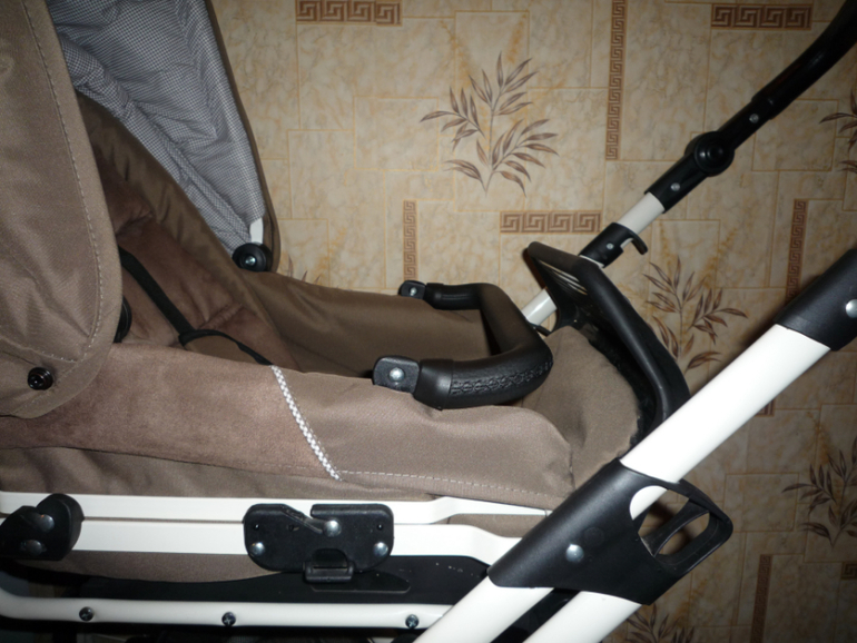 Бампер перед ребенком обтянут эко-кожей. Между ножек - защитная перекладина на кнопке. Минус для меня - бампер не регулируется по высоте и снимать его достаточно сложно (опять же по сравнению с имевшимися колясками).