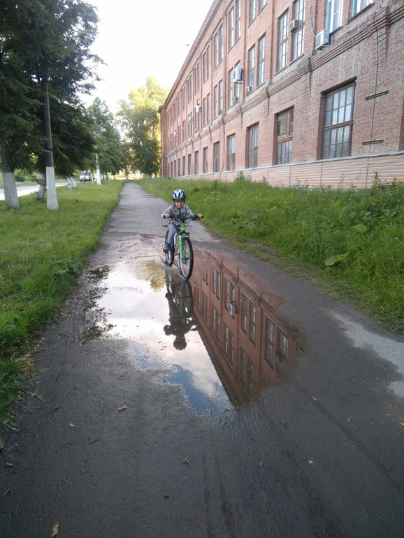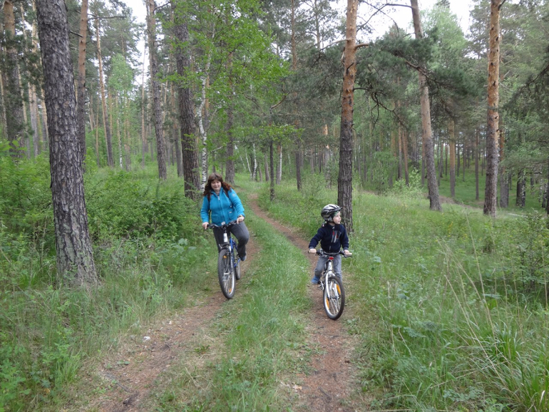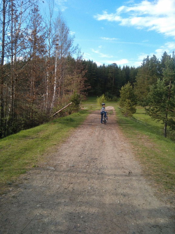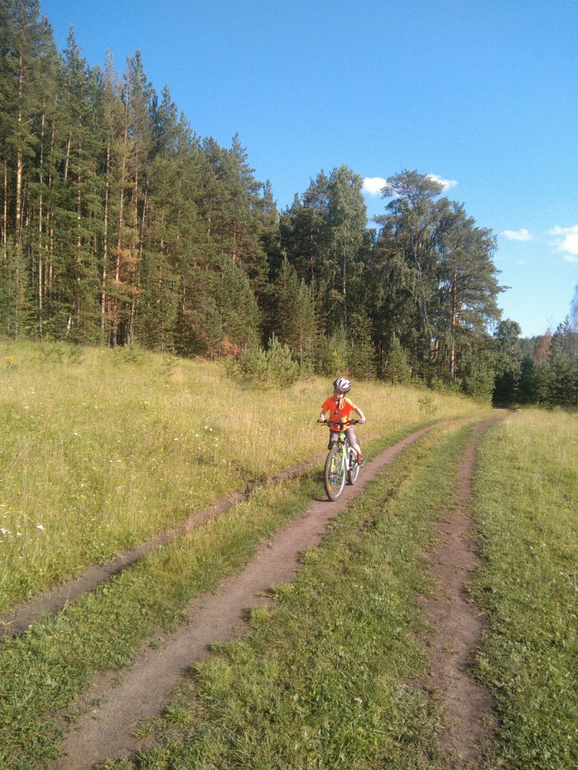 Очень скоро наступил момент, когда ребёнку перестало нравиться кататься "вокруг клумбы", постоянно хотелось смены впечатлений, дальних выездов. Тут и мне пришлось подтянуться и купить для этих целей велосипед себе. Начали кататься сначала в ближайший лес за пруд (дистанции км по 10 в одну сторону по грунту):
