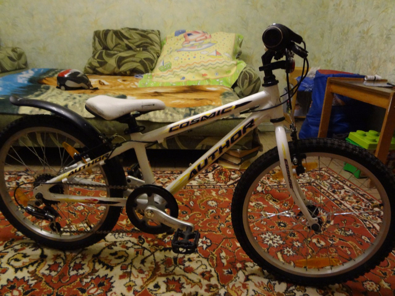 С приближением 5ти-летия захотелось мне обновить вел, начала потихоньку читать тему "от 5ти до 8ми" на форуме "веломании", поняла, что хочу снова author, следующая модель называлась author cosmic, да тут он ещё и подвернулся в вариантах бу за отличную цену, в общем, хапнула, прислали, Ром сразу же и оседлал его в свои 4,8 и ростом около 110.