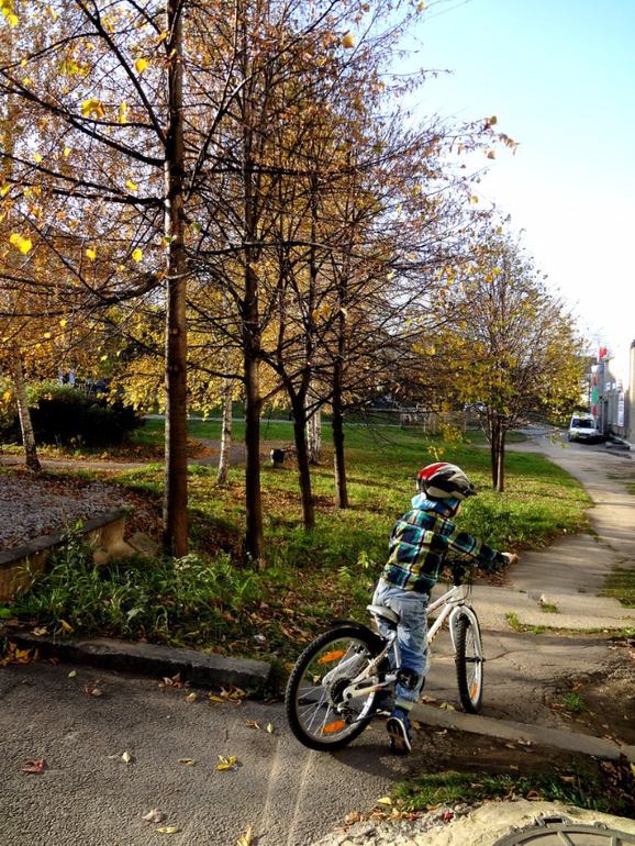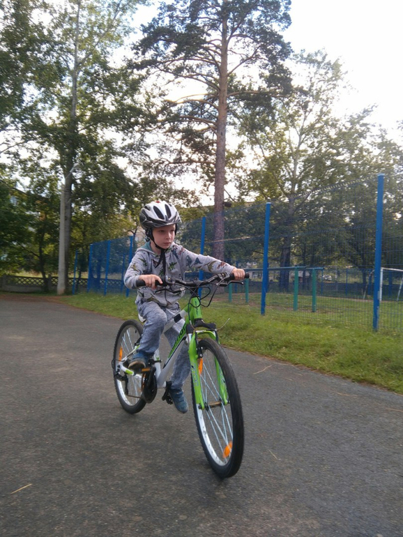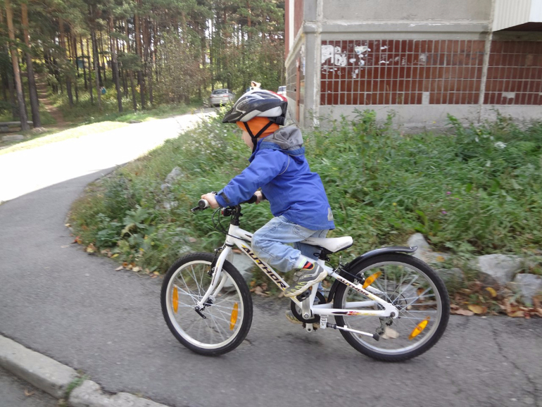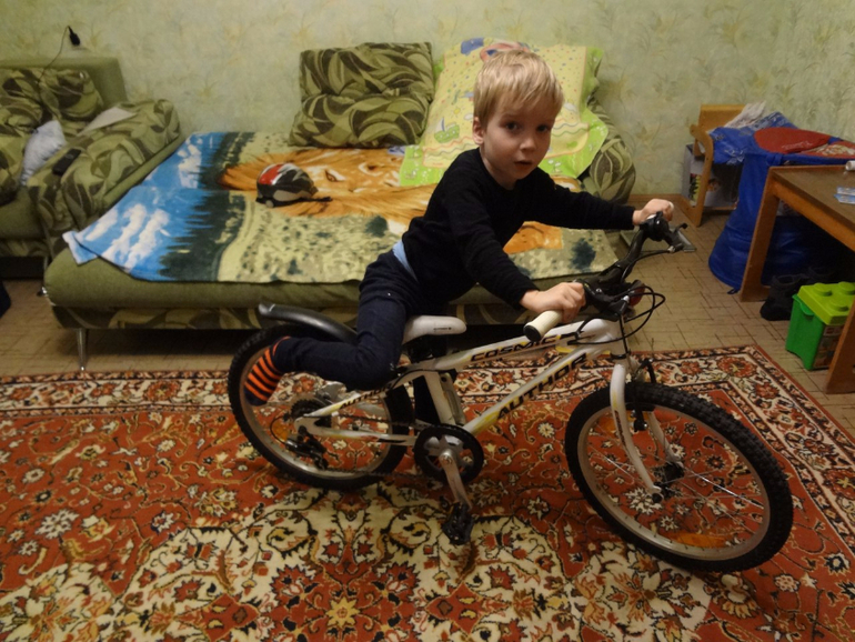 Сейчас Роме 6,5. Катается гораздо увереннее меня. С мужем (уже через слово называет его папой) могут ездить на приличные расстояния, я за ними едва поспеваю. Это при том, что у Ром 20 дюймов. Уже маловат, как мне кажется. Выглядит сейчас это вот так: