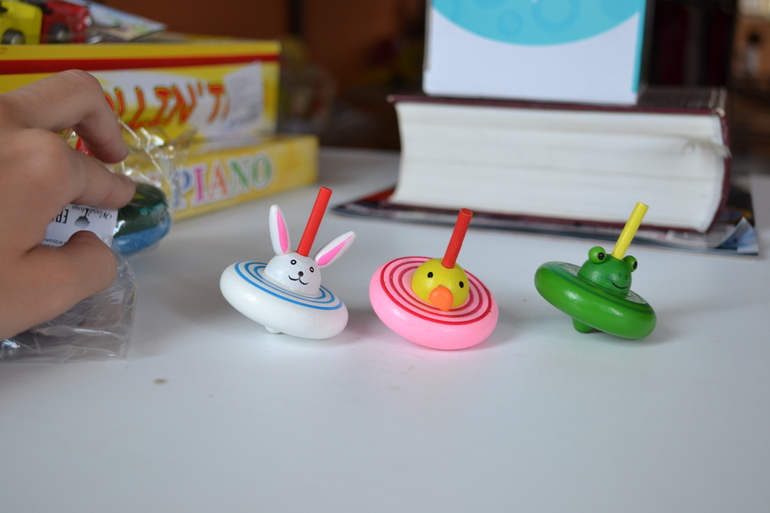 Волчок со зверюшкой. Камилла пока запускать его не умеет, но все-таки пытается что-то с ним делать. И нравится ей очень наблюдать за ним.