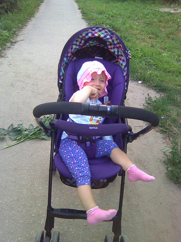 Выставка наших колясок (только хвасты)Сразу скажу, что это уже четвертая априка, которую я катала, так что сравнить есть с чем. Сейчас дома аж три априки, риа, стик, мэджик. Итак, риа, классная, удобная, перекидная ручка это вообще песня. Но...сначала лицом к маме было трудно управлять, казалось, коляска отдельно, я вообще так...потом я вспомнила, как я ездила с каруном, и все ОК. Лицом от мамы вообще просто, как обычная коляска. Не гремит, не могу сказать, что спотыкается как карун, но я и ехала аккуратно, стараясь не создавать таких ситуаций. Мягче каруна, посадка ребенка высокая, завал спинки есть, но дочери нравится, она спинку держит хорошо, поэтому спокойно может сесть сама, да и на бампер если что, может опереться. У нас сегодня жарко, солнце, кап и перекидная ручка, и дочери очень комфортно. Ткань очень приятная, но надо быть очень аккуратно, иначе будут зацепки. Можно решить эту проблему матрасиком, я просто сняла обувь, тем более она сама ее начала снимать. На обратном пути заснула, это главный показатель, что коляска классная. Что касается спинки, моей на удивление эти уши понравились, она просто положила на них голову, мягко, комфортно, я сама получила довольствие от прогулки. Фотки добавлю позже.
