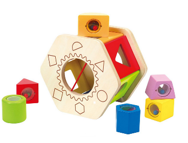 Она представляет собой шестигранник с разноцветными гранями. На них имеются отверстия в форме треугольника, круга, квадрата, полукруга, трапеции и шестиугольника. В комплект входят шесть деревянных фигурок разных цветов. Задача малыша заключается в том, чтобы опустить фигурки в соответствующие им отверстия. Внутри каждой фигурки за прозрачными окошками находятся разноцветные бусинки, которые будут перекатываться и греметь, развлекая ребенка. Когда все фигурки окажутся внутри, достать их можно через отверстия в основаниях игрушки.