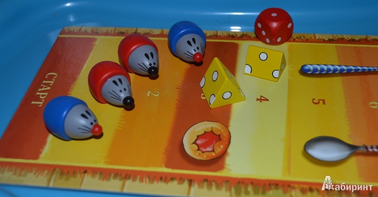 Игра-ходилка для двух игроков. 2 красных мышонка, 2 синих мышонка, кубик, 2 кусочка сыра, двусторонний игровой планшет. Маленькая, коротенькая, яркая, приятная. Это наша первая ходилка. Хочется ещё))) Смысл прост: бросаем кубик, сколько точек выпало, на столько и продвигаем мышонка вперёд. Кто первый добрался, тот первый съел свой кусочек сыра. Для того, чтобы второй игрок не расстраивался, в игре есть 2 кусочка сыра, всем достанется)))
