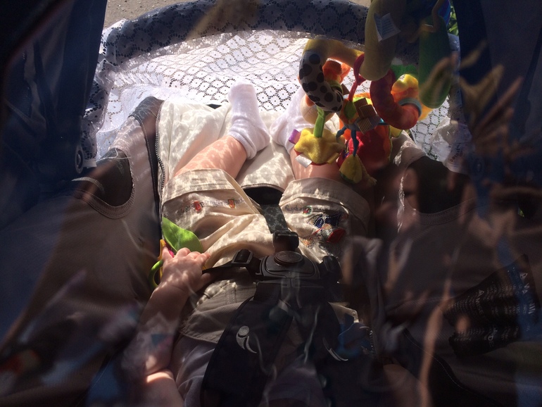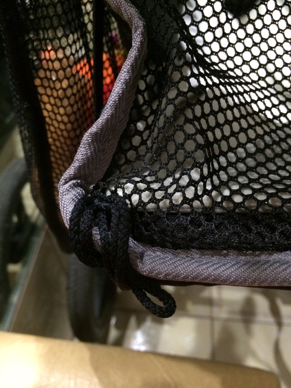 А так я вожу ее с магазина домой, закрепляю ремешком на липучке, у меня на сумке были дополнительные крепления, вот теперь пригодились ) Висят на ручке коляски, иногда пакеты на них легкие вешаю.