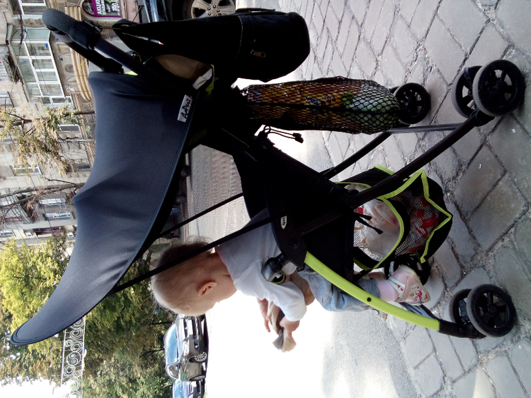 ,но вопрос с солнцем решен кардинально! А сетка просто класс! Вмещает много и коляска не переворачивается. Крепится липучками к раме.