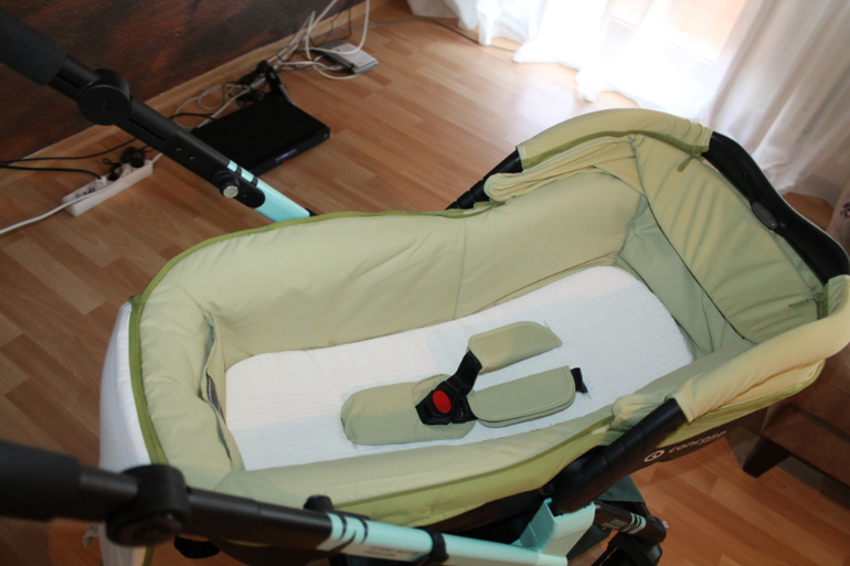 Короб пластиковый, внутри мягенький. Ткани, не знаю, что это именно, но на ощупь приятные. На капюшоне и на люльке отличается ткань не только оттенком. На шасси устанавливается легко, одной рукой, впрочем как и снимается. Для дополнительной устойчивости ремешки по бокам крепятся к шасси. Внутри размер люльки (по матрасику) 30 на 66 см. (Что то я измерила, и меня это только что смутило)