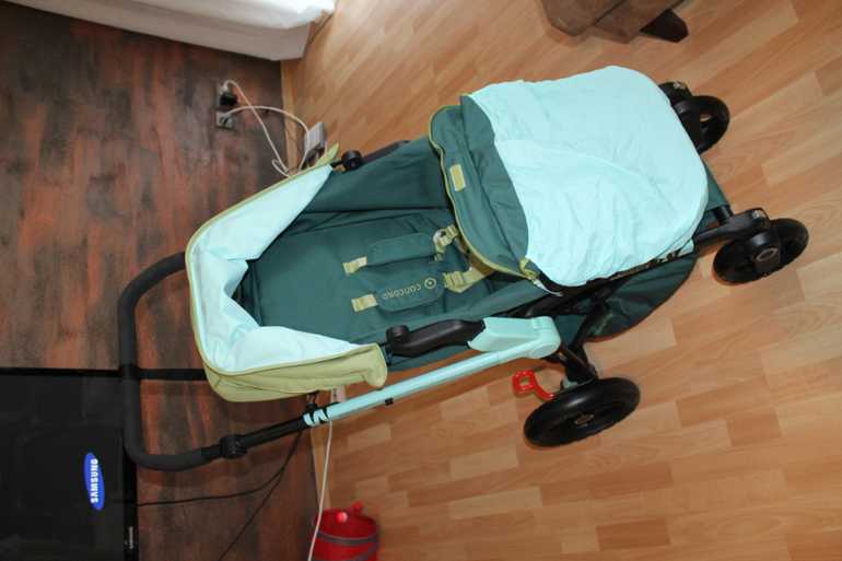 Капюшон можно опустить нажатием на одну кнопочку сверху на ручке, козырек отвернуть тоже можно. Подголовник регулируется по высоте, можно поднять в полусидячее положение. Ремни-для перевозки в машине, люлька допущена.