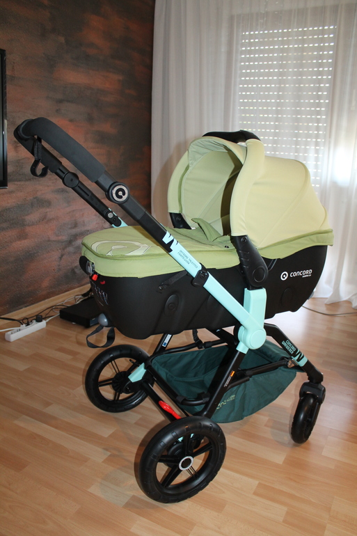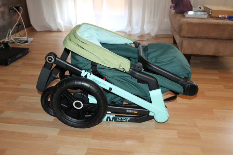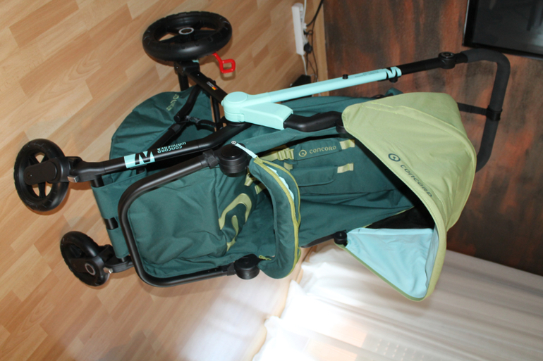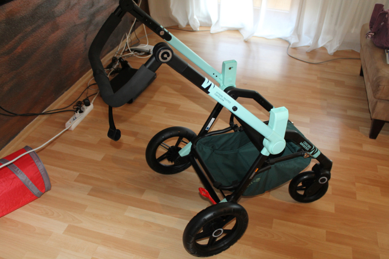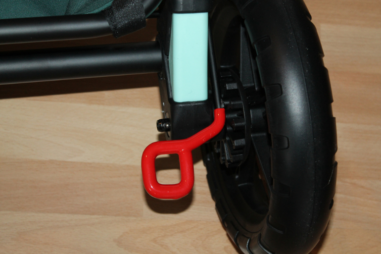 Т.к. мы еще не родились, не могу написать о проходимости. Находила в интернете пару хороших отзывов. Как заявлено производителем коляска предназначена для бездорожья, прогулок по лесу, горам и т.д. Это создает надежду на лучшее. Амартизация на всех колесах, на задних (по словам мужа) резинки, на передних пружины. Колеса резиновые, основательные. Задние можно снять легким нажатием. Высота ручки 108 см, мой муж ростом 187 см, доволен. И еще минус- корзинка маленькая, совсем маленькая. Вот эта красненькая штучка-это тормоз. Складывается очень легко.