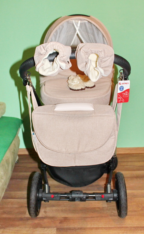 Также имеется сумка для мамы, которая крепится на ручке коляски. Сумка обладает двумя отделениями. Также в комплекте с коляской идет дождевик и антимоскитная сеть.