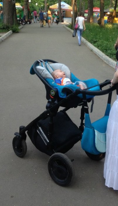 Пользуем коляс 3 с половиной месяца. Пока только люльку и автокресло. Однако в 2 с поливной месяца деть категорически отказался пребывать на прогулке в люле, надоело смотреть на небо и кроны деревьем. Посему была приобретена Априка, но об этом в следующей записи.