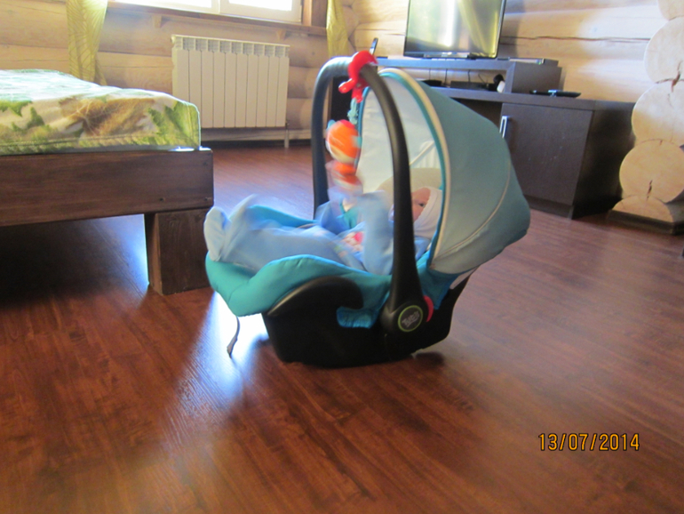Автокресло. Легко установливается в авто, на кресле сбоку наклейка с инструкцией-картинкой. Довольно удобен кап который можно снять, в авто я его не снимаю, чтоб детке не слепило солнце. Если куда-то на авто, то в багажник только шасси. Приехали, автокресло на раму и гулять. Малышу нравиться - там обзор лучше. Очень здорово что к автокреслу также есть накидка на ножки. Кстати спит там лучше чем в люльке.