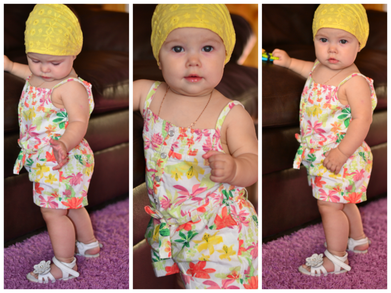 А собственно почему я о размерах...Комбинезончик,как впрочем и вся одежда,был куплен к следующему лету и имел маркировку 18мес.Вот так он сидит на моей некрупной модели 7 месяцев отроду.