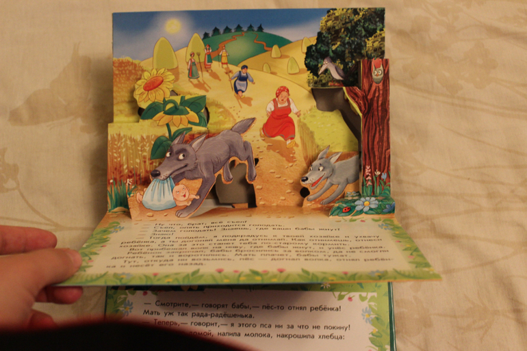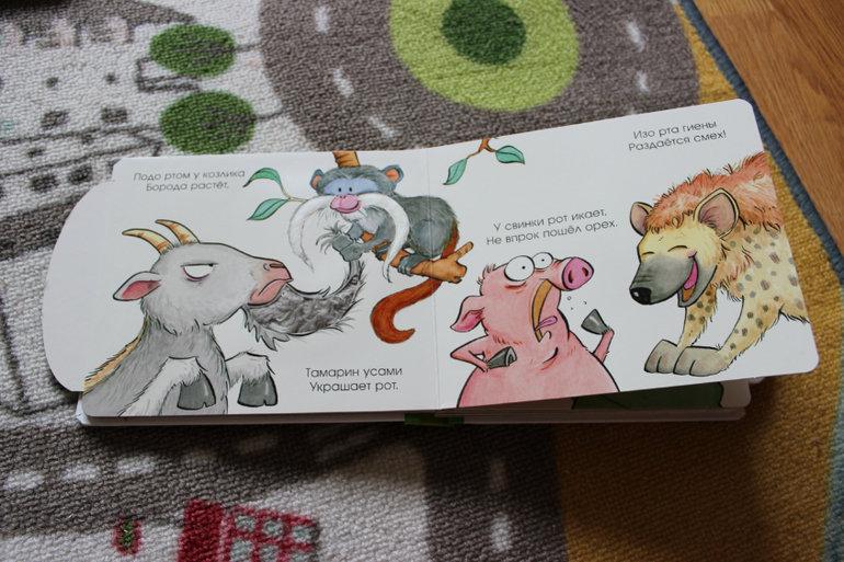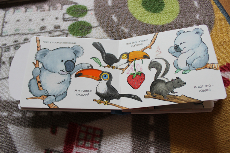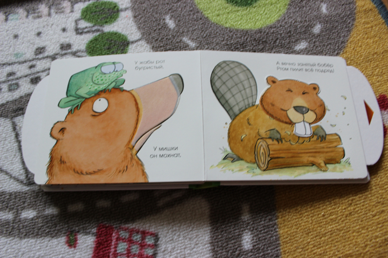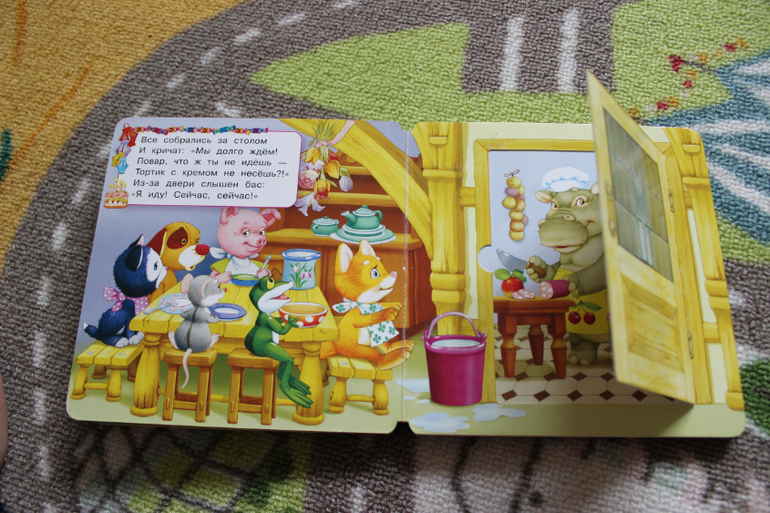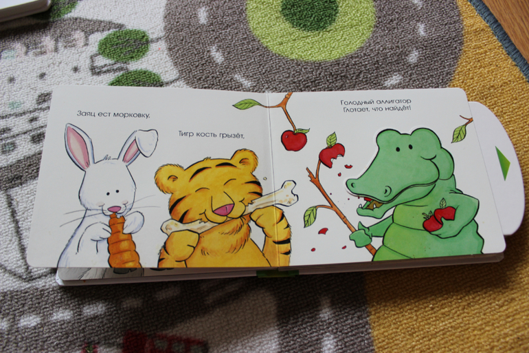 Книги небольшие, с толстыми страничками, и наверное больше "игрушечного" характера. На страницах есть тактильные элементы. С краю у каждой страницы есть стрелочка, которая приводит в движение одного из персонажей. В книге чисто символические, коротенькие стишки. Но все равно идея хорошая.