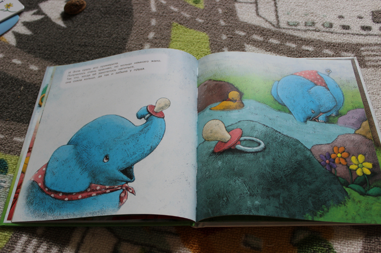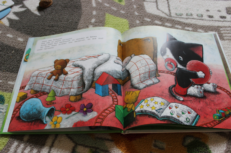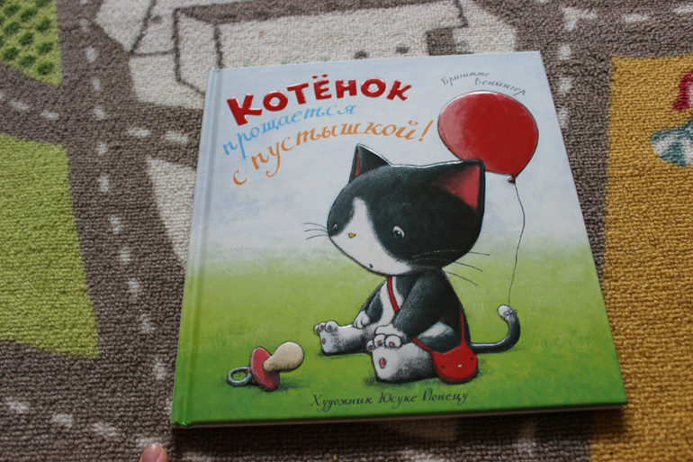 Приобрела по положительным отзывам. Мне в принципе книга понравилась. Картинки очень красивые и милые, идея неплохая. Вкратце - котенок потерял свою пустышку. Она оказалась на улице и каждый герой книги по-своему пытались ее приспособить. Забавно. В конечном итоге, когда пустышка снова попала к котенку он привязал ее к воздушному шарику и пустил в небо, аргументируя, что таким большим деткам пустышка уже не нужна. Связи я не увидела, но возможно я уже просто цепляюсь)