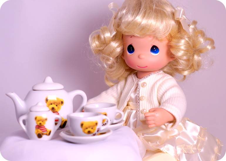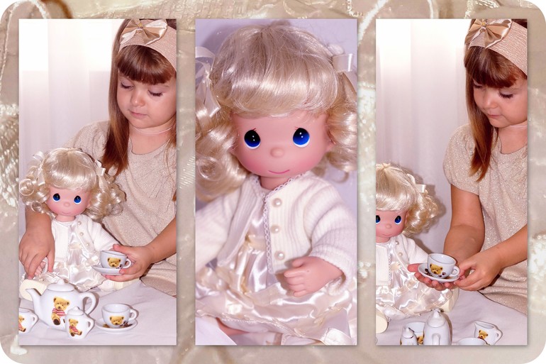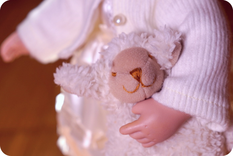 Дочка не играет с Соней дни напролет, но не забывает и очень ревностно к ней относится - постоянно угощает чаем из своей фарфоровой посудки, рассказывает сказки или нежно поглаживает очаровательную овечку Сони.