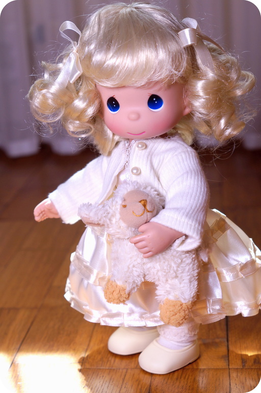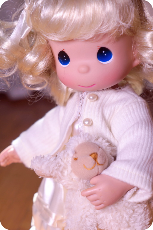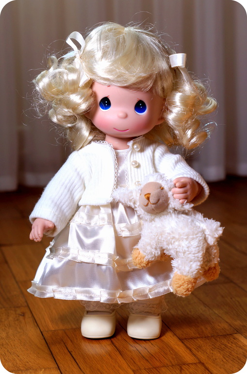 Светлые волосы кокетливо завиваются, длинная челка и трогательные бантики по бокам. Ее ручки нежно прижимают к себе очаровательную милую овечку. А глаза-капельки бездонны и печальны...