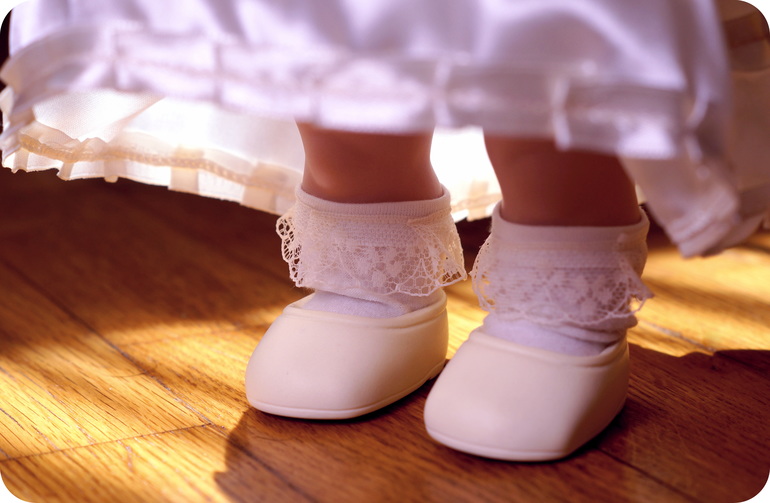 Маленькие лаковые туфельки, кружевные носочки, атласное кружевное платьице цвета айвори, изящный вязаный жакет с жемчужными пуговичками...